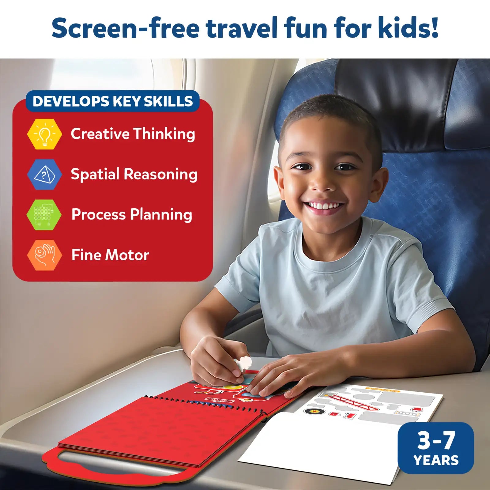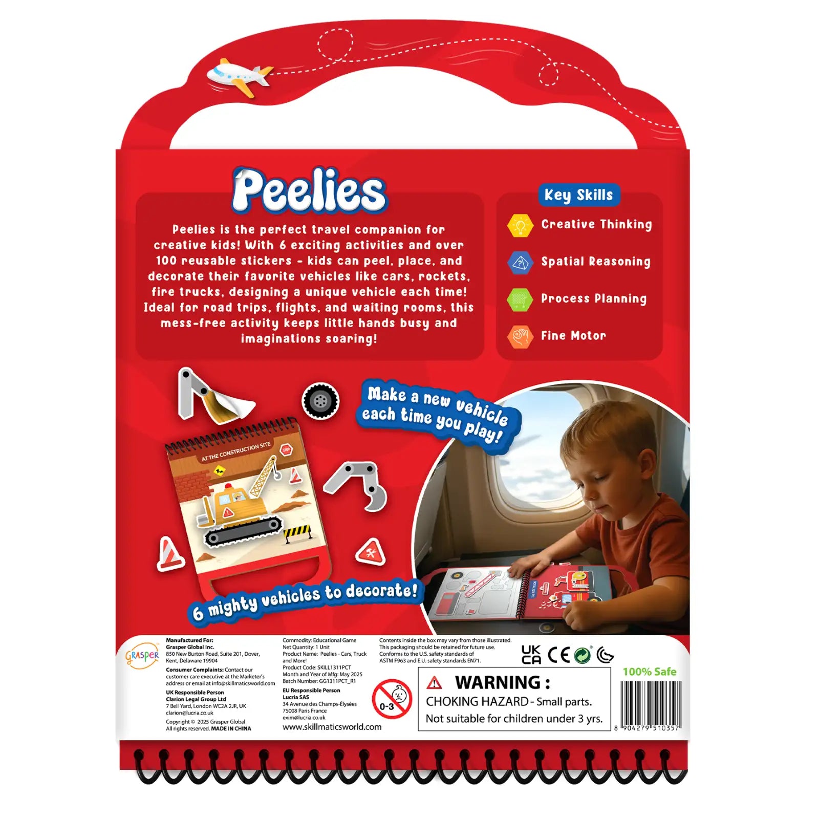 Skillmatics Peelies features 6 fun-filled activities and 100+ reusable stickers! Kids can peel, place, and decorate their favorite vehicles like cars, rockets, and fire trucks, designing a new ride each time they play.