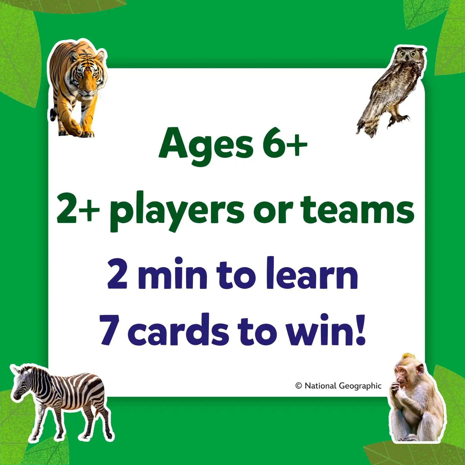 Step into the world of National Geographic with Guess in 10! Ask up to 10 yes or no questions to identify the animal on the game card. Think fast, ask smart questions, use clue cards strategically, and be the first to collect 7 cards to win.